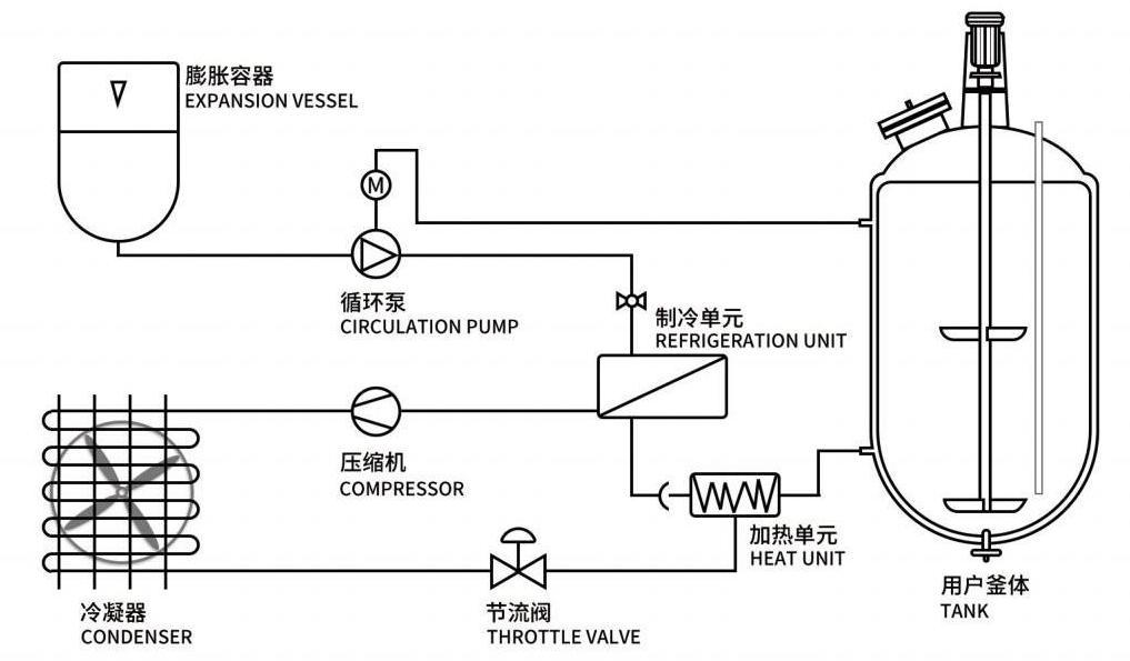 密閉型高低溫一體機(jī)整個(gè)系統(tǒng)的液體循環(huán)是密閉的,系統(tǒng)帶有膨脹容器(儲(chǔ)液槽),膨脹容器和液體循環(huán)是絕熱的,并不參與液體循環(huán),只是機(jī)械的連接,不管液體循環(huán)的溫度是高溫還是低溫,膨脹容器中的介質(zhì)低于60度。整個(gè)液體循環(huán)是密閉的系統(tǒng),低溫時(shí)沒有水汽的吸收,高溫時(shí)沒有油霧的產(chǎn)生,介質(zhì)可以有很廣的工作溫度。
